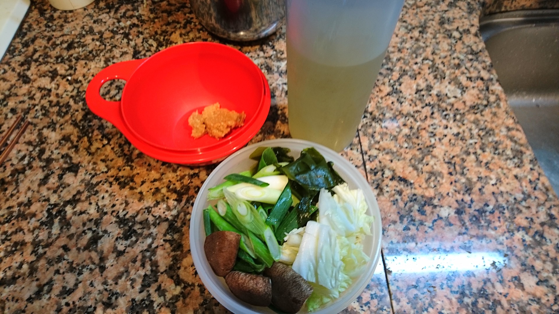 今朝は、白菜、九条ねぎ、生しいたけ、わかめの味噌汁です。