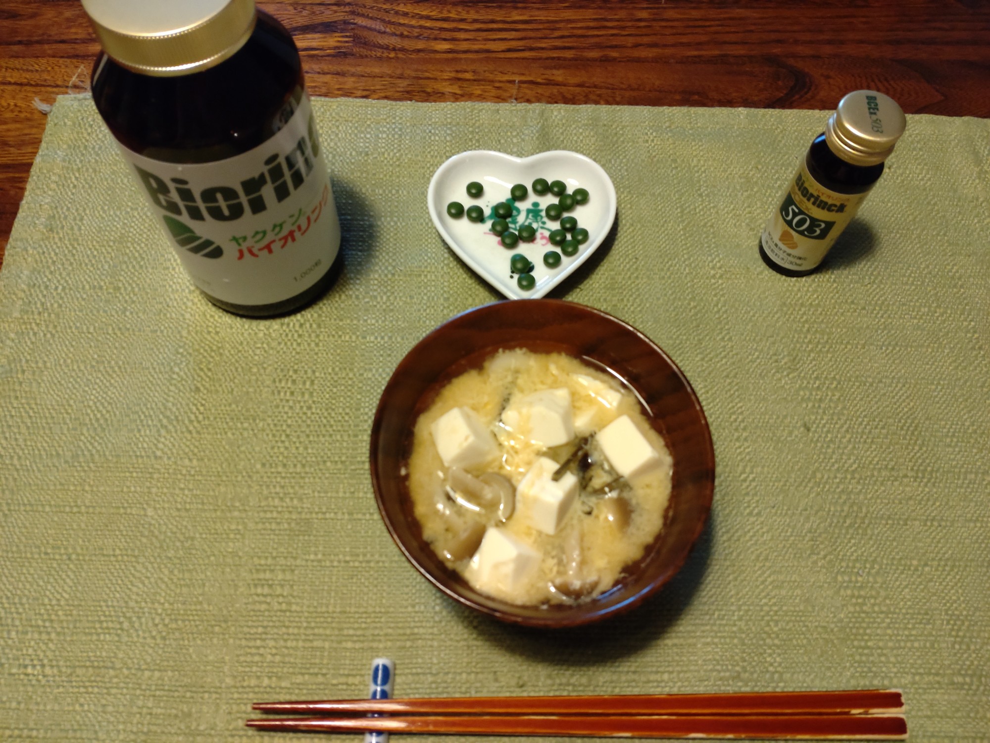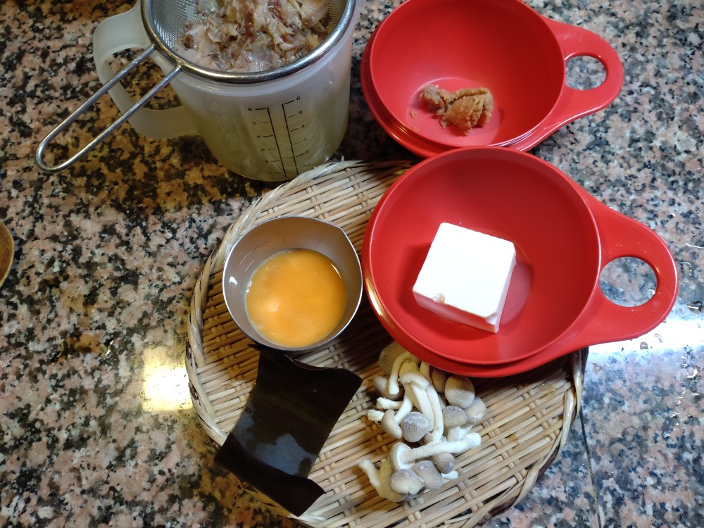 今朝は、しめじ、絹ごし豆腐、出汁をとったあとの利尻昆布、溶き卵の味噌汁です。