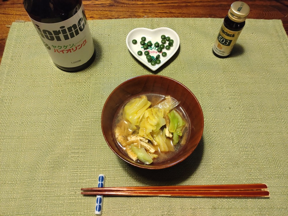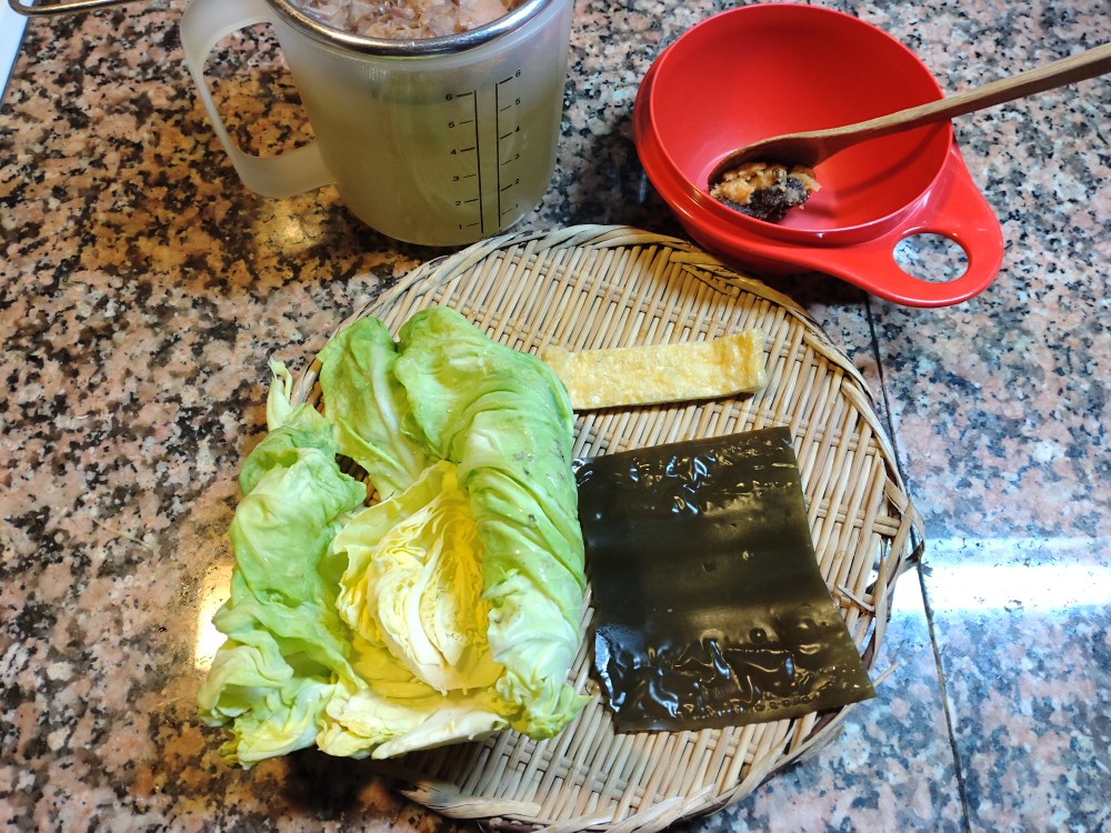 今朝は、キャベツ、うすあげ、出汁をとった後の日高真昆布の味噌汁です。