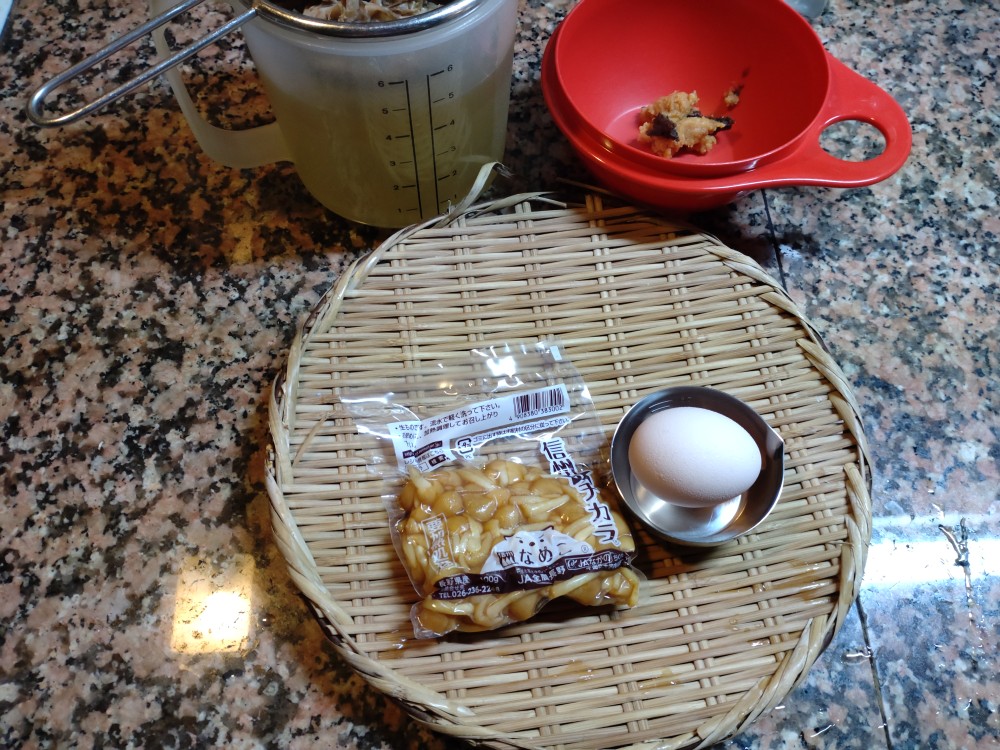 今朝は、なめこ、鶏卵の味噌汁です。