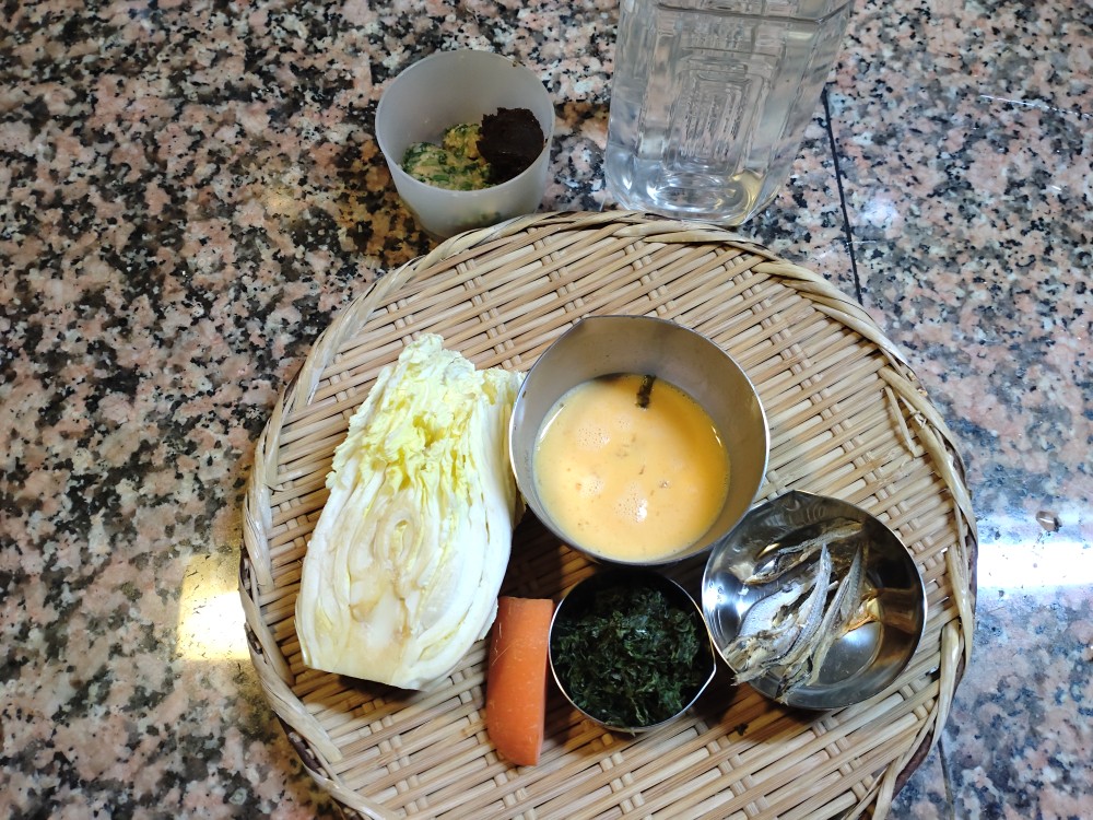 今朝は、白菜、人参、焼き海女のり、溶き卵、いりこの味噌汁です。