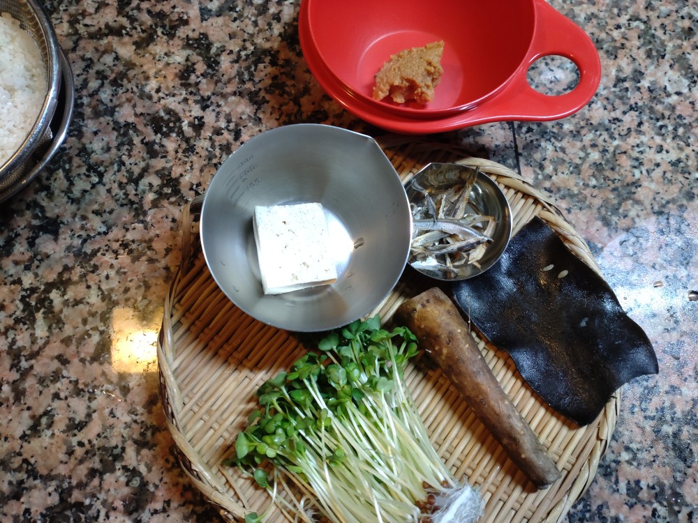 今朝は、かいわれ大根、出汁をとったあとの日高真昆布、ながいも、いりこの味噌汁です。