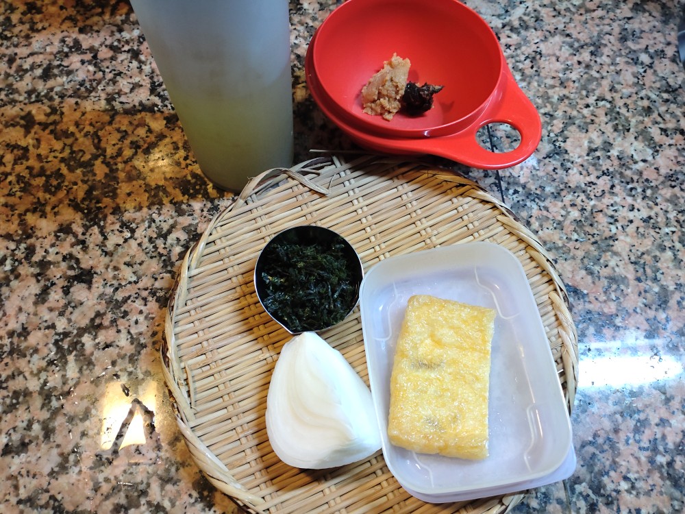 今朝は、新玉ねぎ、うすあげ、焼き海女海苔の味噌汁です。