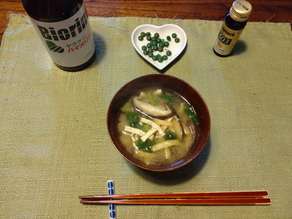 今朝は、生しいたけ、うすあげ、小かぶの葉、いりこの味噌汁です。