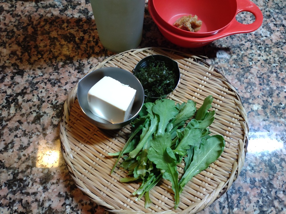 今朝は、春菊、焼素干し海苔、絹ごし豆腐の味噌汁です。