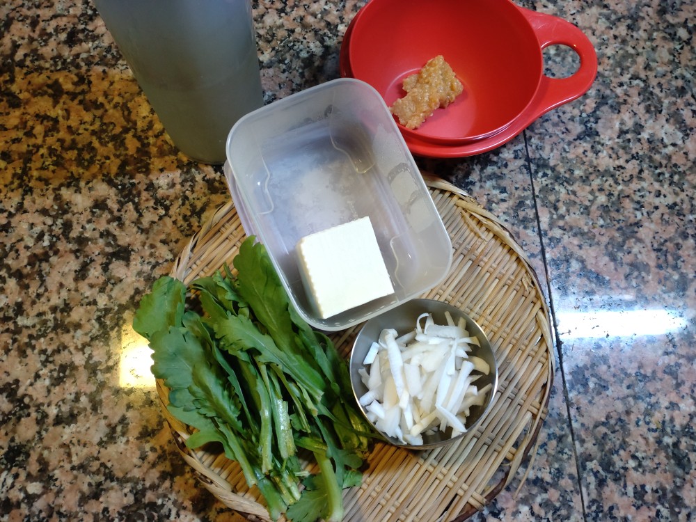今朝は、春菊、絹ごし豆腐、大根の味噌汁です。