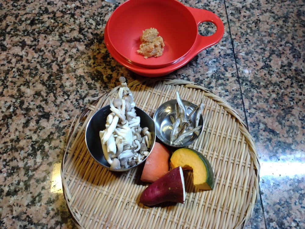今朝は、人参、さつまいも、かぼちゃ、しめじ、いりこの味噌汁です。