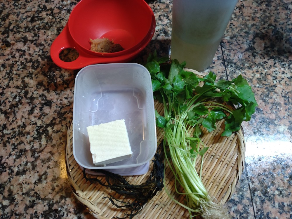今朝は、木綿豆腐、わかめ、みつばの味噌汁です。