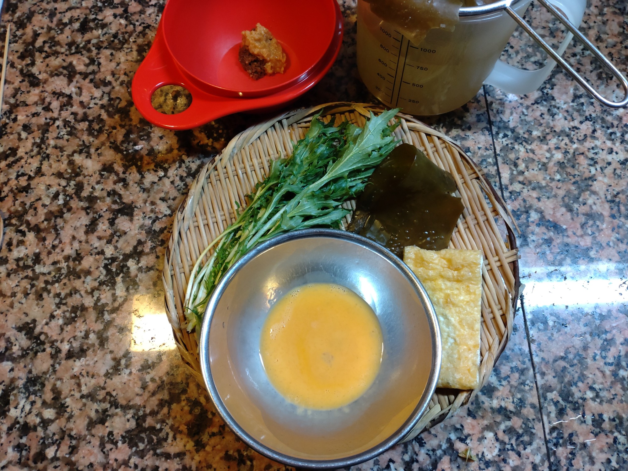 今朝は、水菜、出汁をとった後の羅臼昆布、うすあげ、溶き卵の味噌汁です。