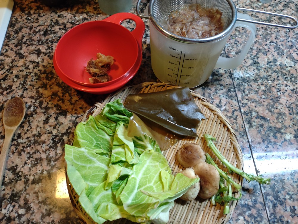 今朝は、春キャベツ、生しいたけ、出汁をとったあとの羅臼昆布、春菊の芯の味噌汁です。