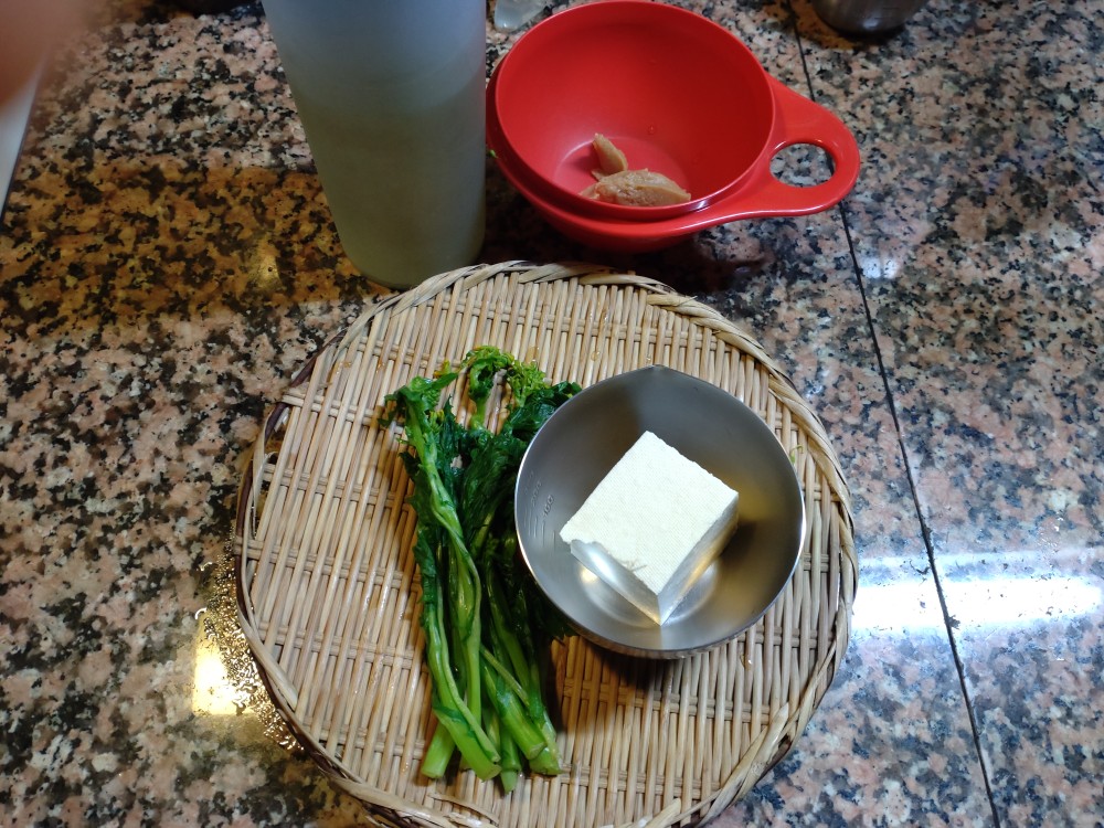 今朝は、菜花、木綿豆腐の味噌汁です。