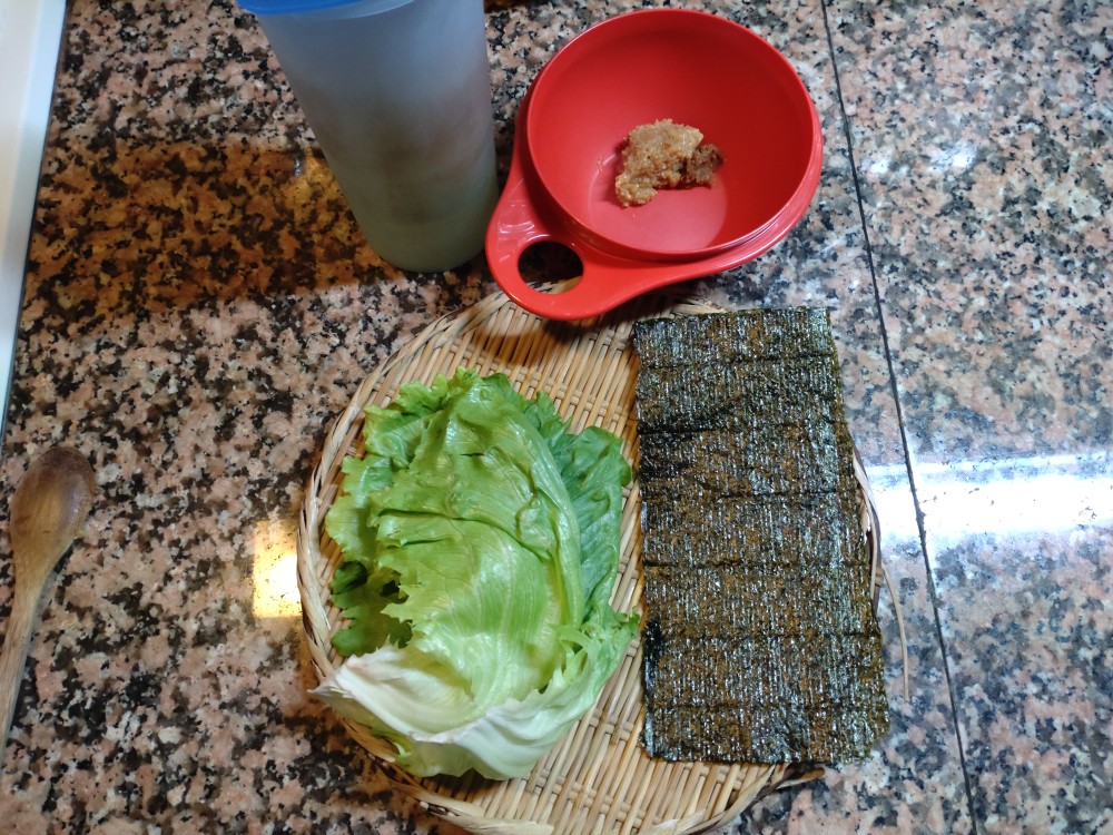 レタスと焼き海苔の味噌汁は、火にかける時間が少なくて出来上るので、夏には作り易く、