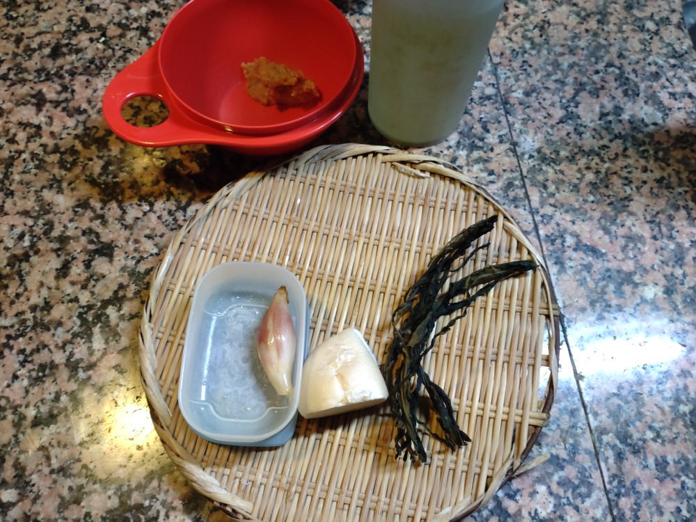 今朝は、やまいも麩、わかめ、茗荷の味噌汁です。