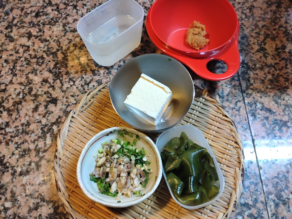 今朝は、木綿豆腐、わかめ、昨晩のこんにゃく蕎麦の薬味、鶏ささみの茹で汁の味噌汁です。