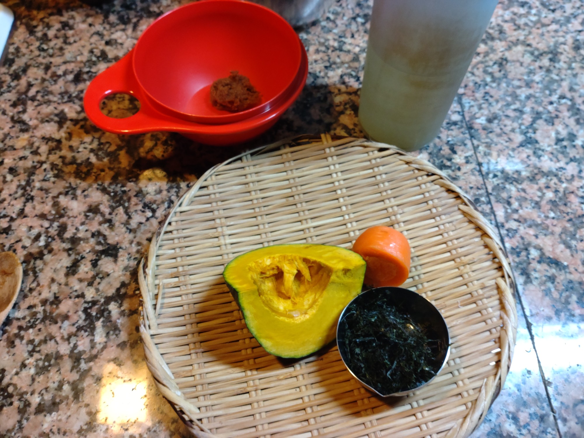今朝は、人参、かぼちゃ、あおさ入り海苔の味噌汁です。