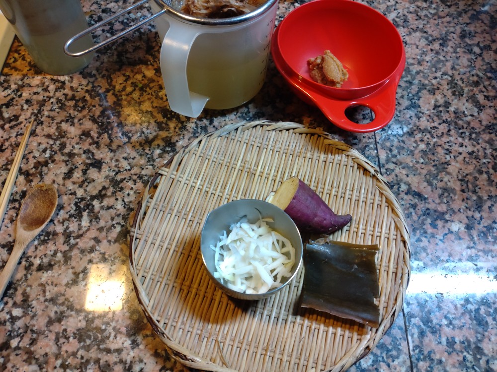 今朝は、さつまいも、大根、出汁をとった後の羅臼昆布の味噌汁です。