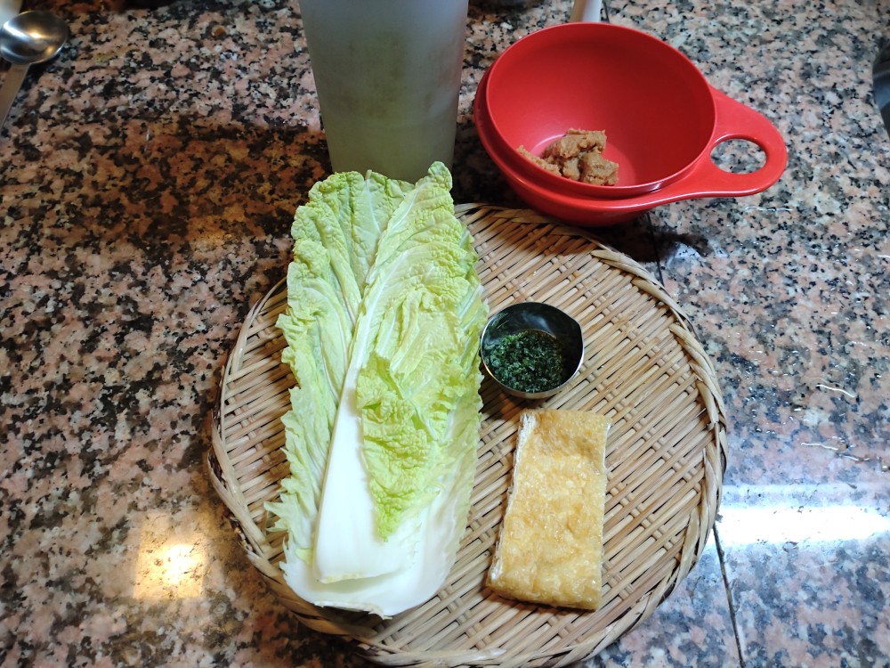 今朝の味噌汁は、白菜、うすあげ、あおさの味噌汁です。