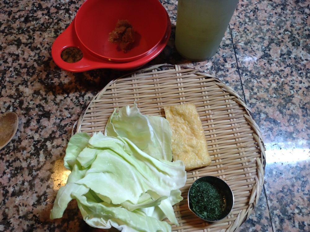 今朝は、キャベツ、うすあげ、あおさの味噌汁です。