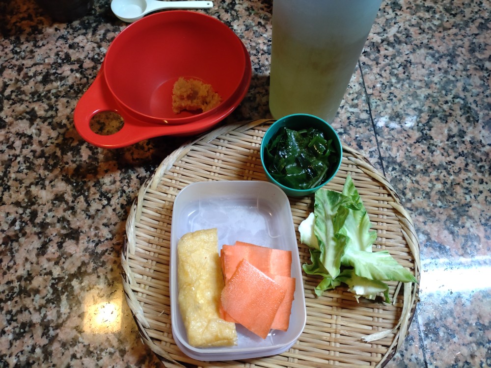 今朝は、人参、きゃべつの芯、わかめ、うすあげの味噌汁です。
