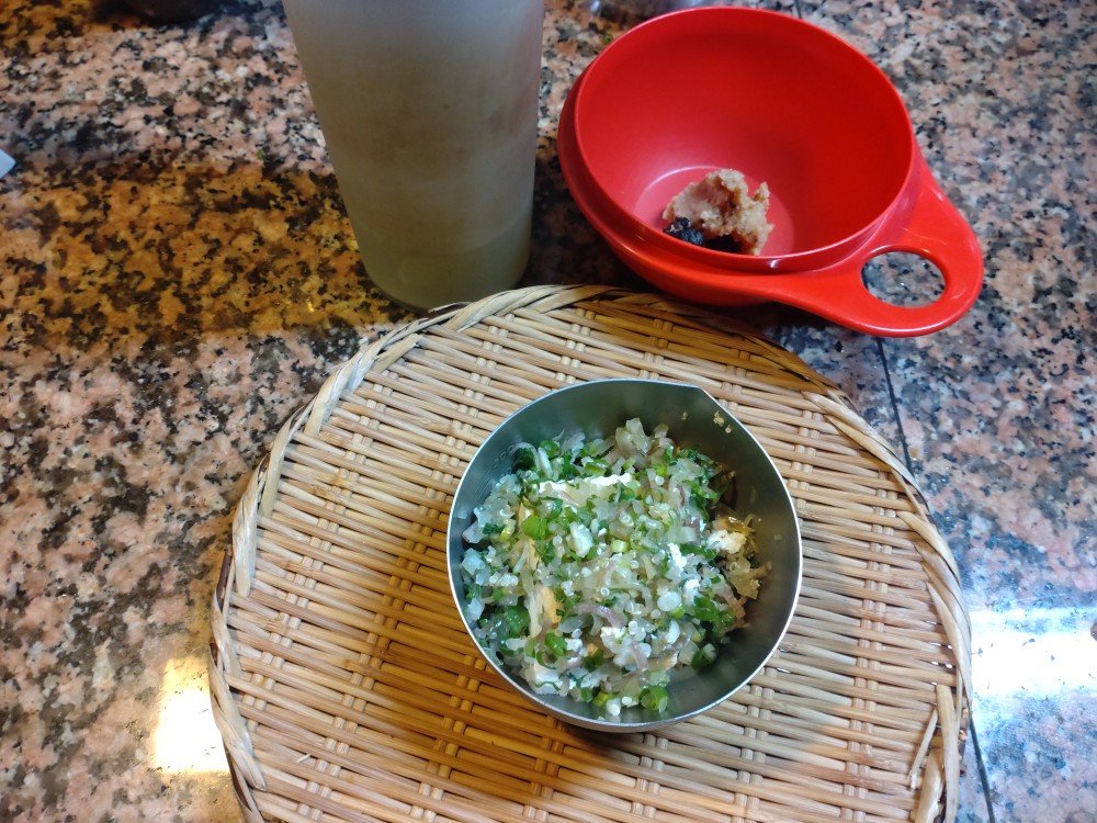 薬味が、塩抜きザーサイ、青ネギ、みょうが、大葉、キヌア。