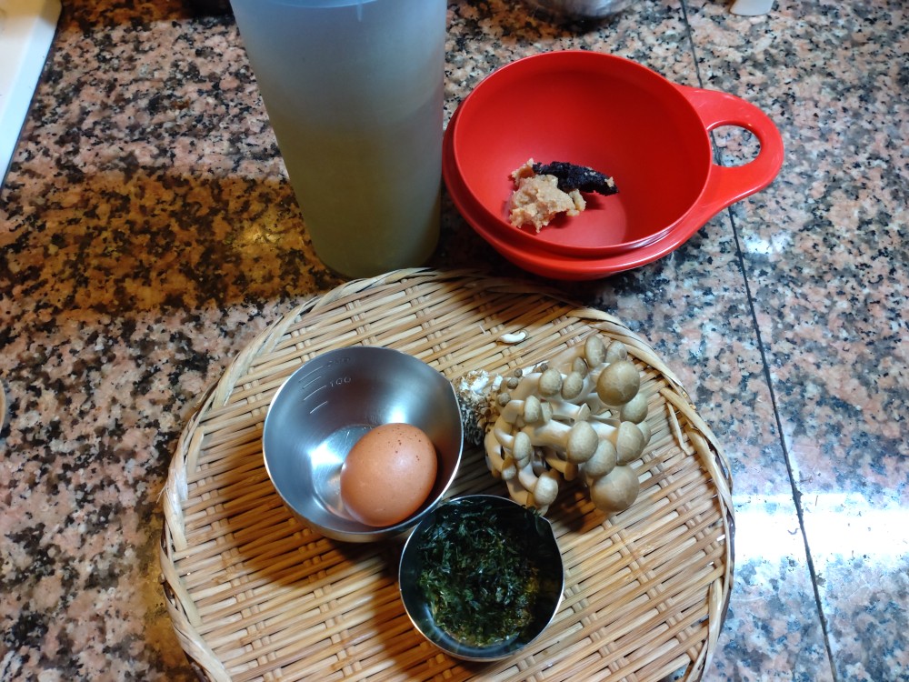 今朝は、鶏卵、しめじ、あおさ入りつまみ海苔の味噌汁です。