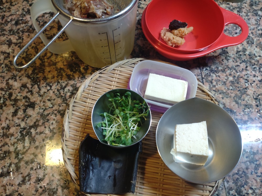 今朝は、木綿豆腐、高野豆腐、出汁をとったあとの羅臼昆布、かいわれ大根の味噌汁です。