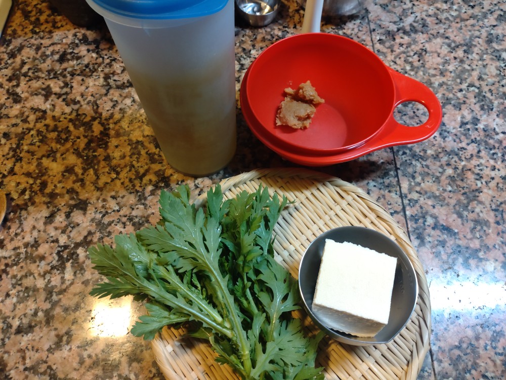 今朝は、春菊、木綿豆腐の味噌汁です。