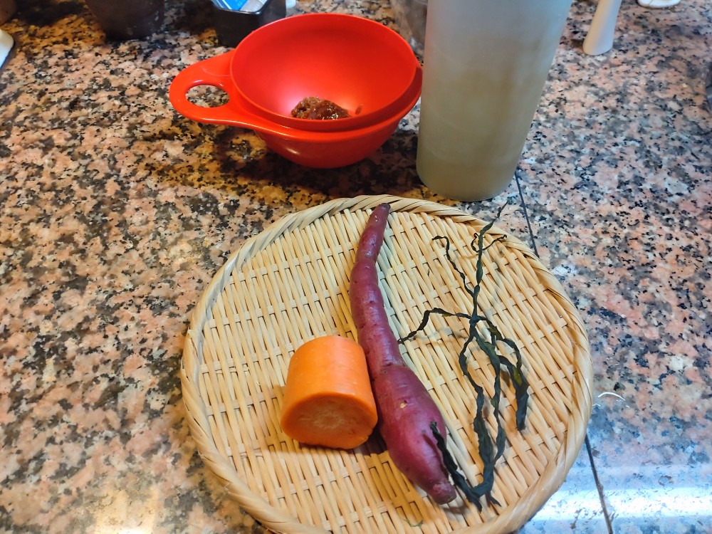 今朝は、人参、さつまいも、わかめの味噌汁です。
