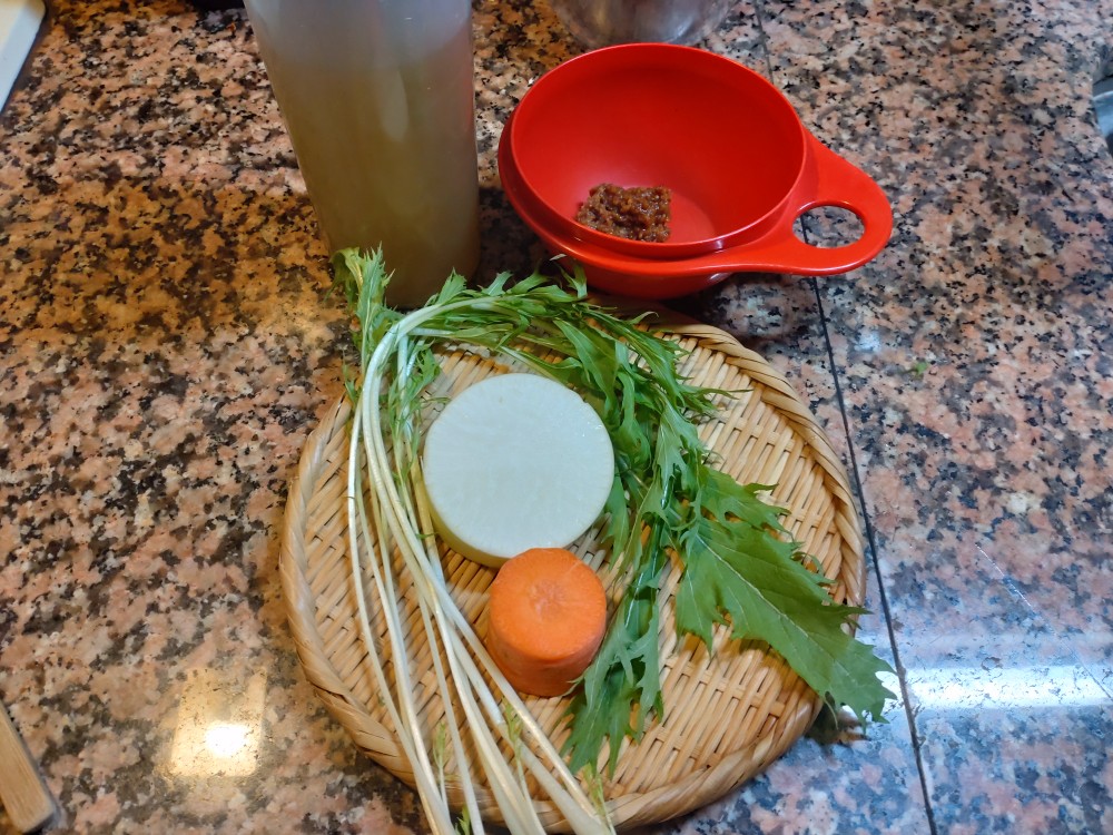 今朝は、大根、人参、水菜の味噌汁です。