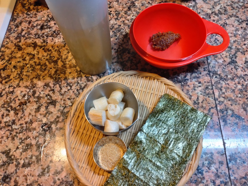 今朝は、焼き麩、成清海苔店さんの寿司はね焼き海苔、すり胡麻の味噌汁です。