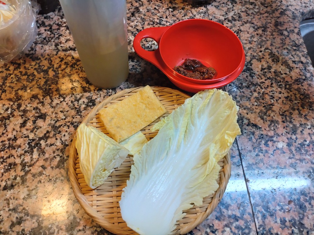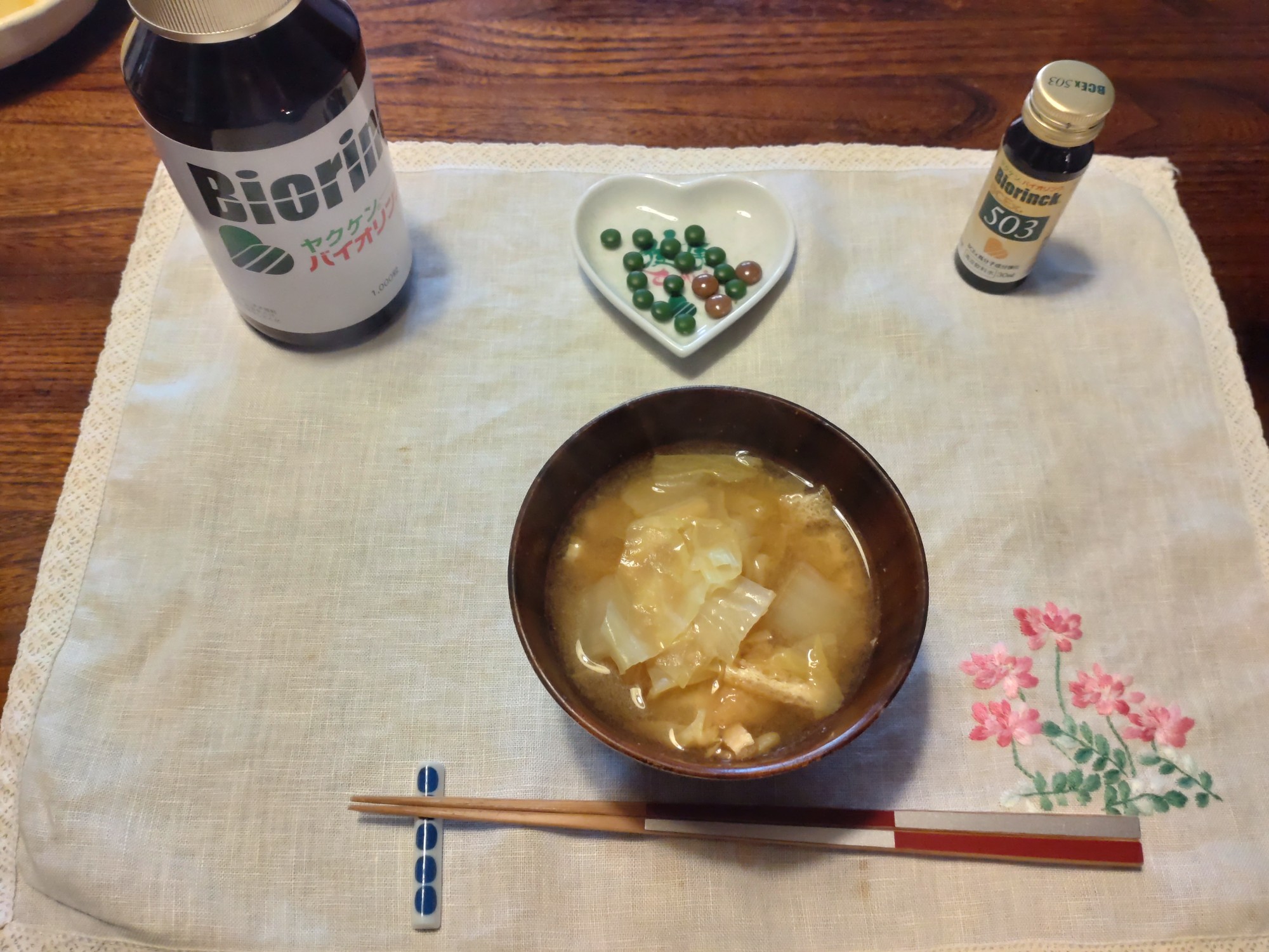 今朝は、きゃべつ、白菜、うすあげの味噌汁です。