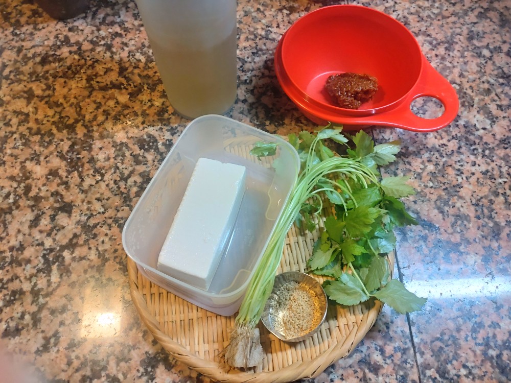 今朝は、絹ごし豆腐、三つ葉、すりごまの味噌汁です。
