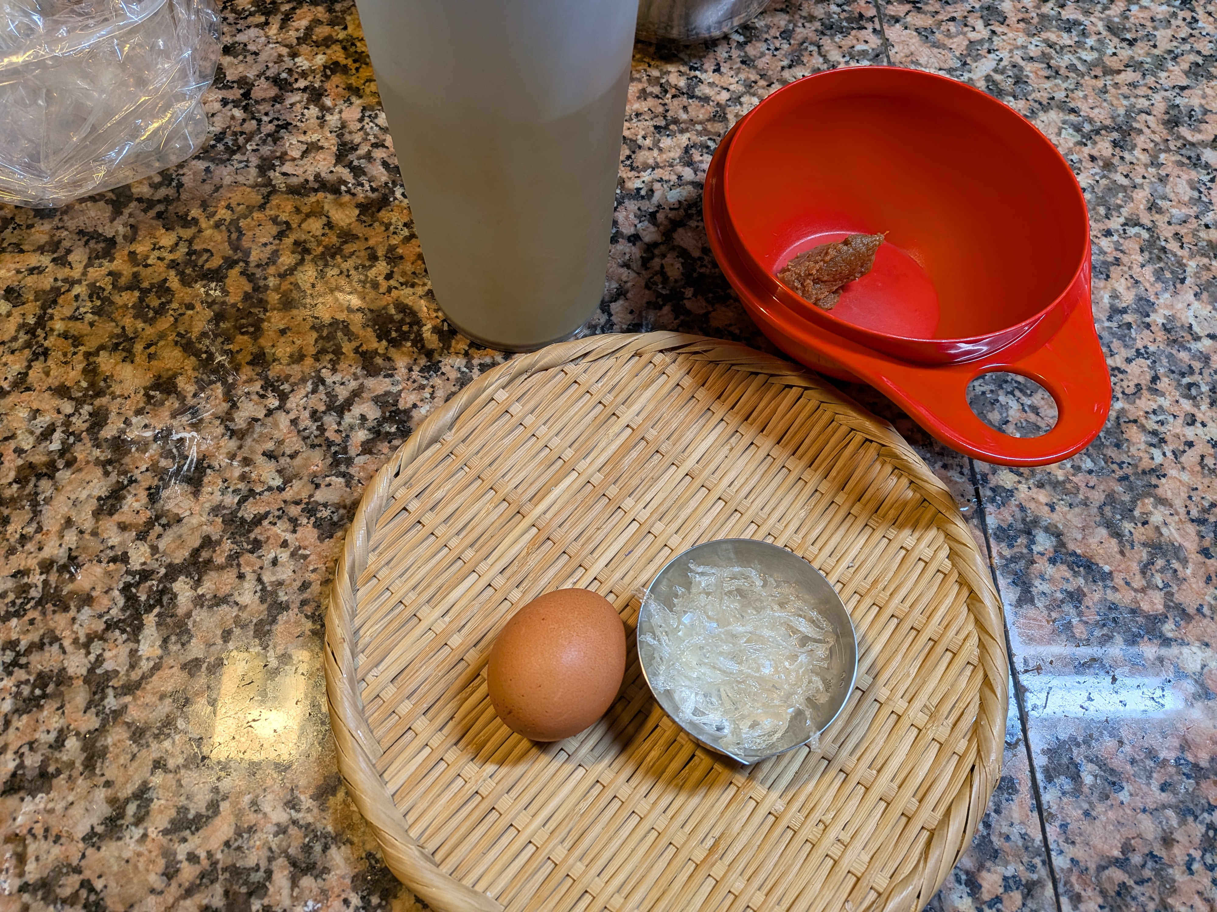 今朝は、鶏卵、スープ用寒天の味噌汁です。