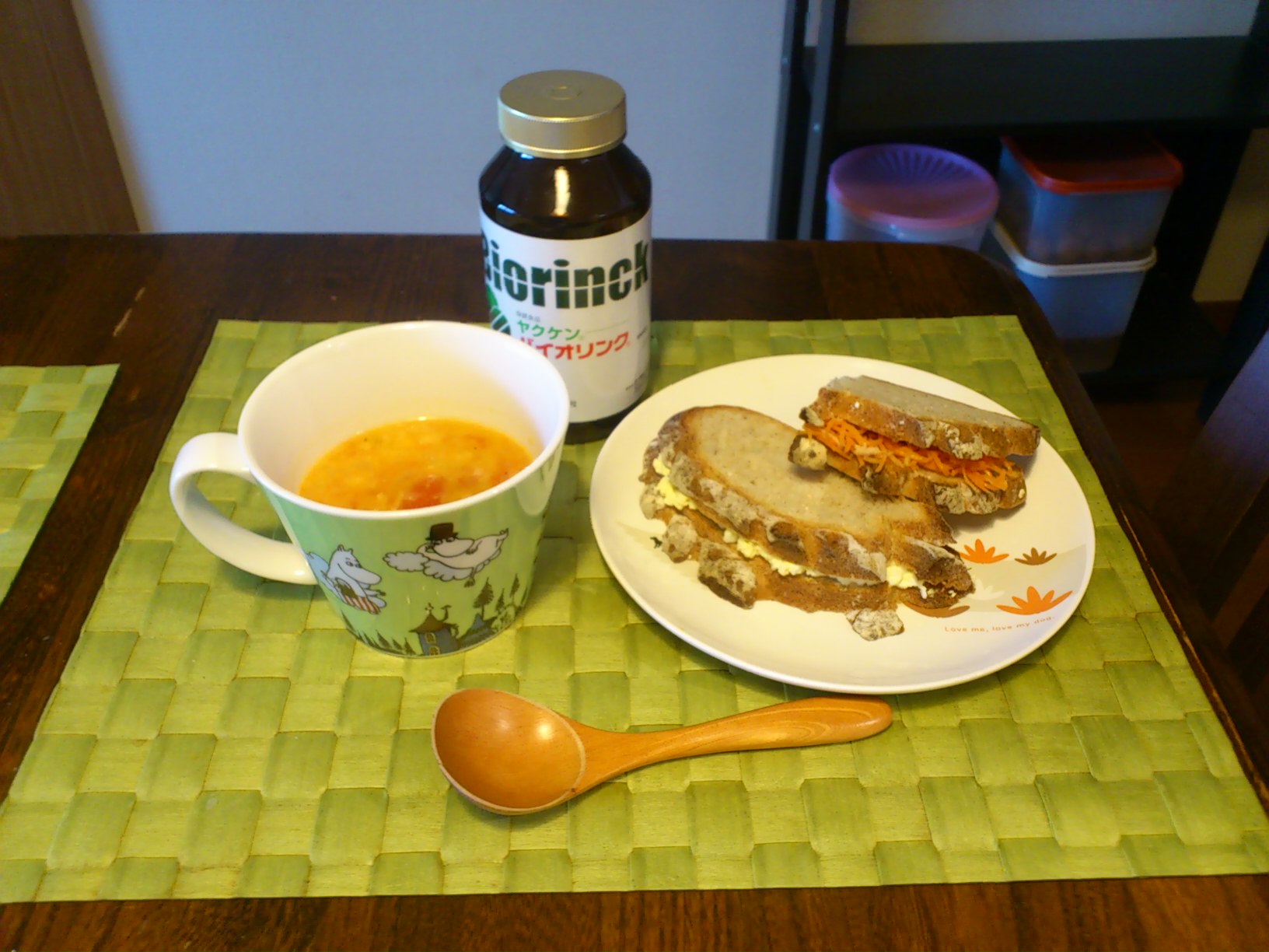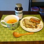 今日は冷蔵庫に残っていたもののスープです。