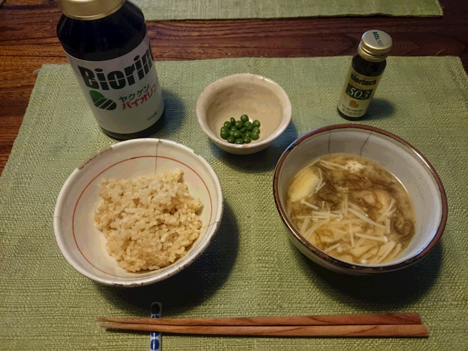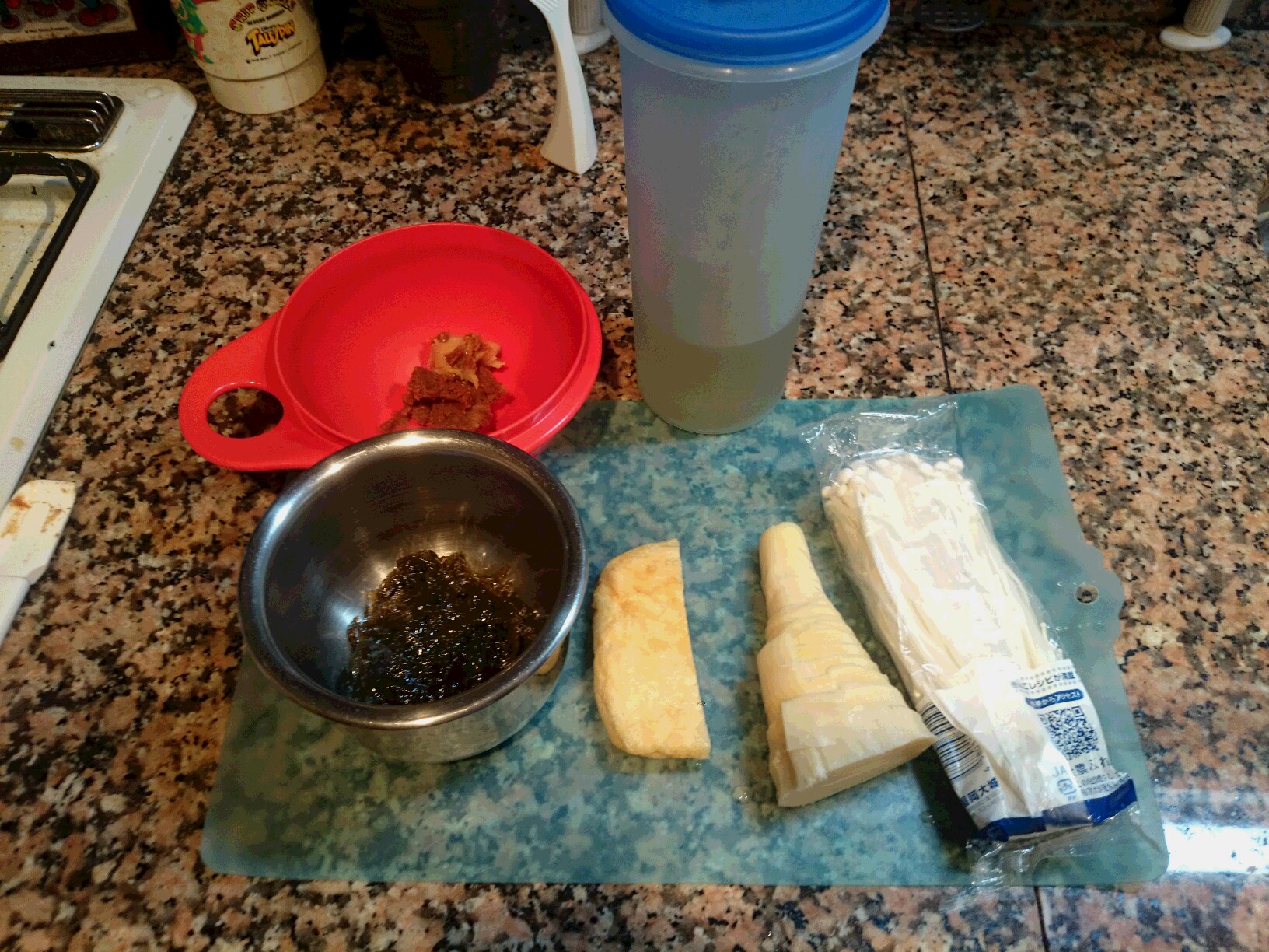 今朝は、もずく、うすあげ、えのき、たけのこの味噌汁です。