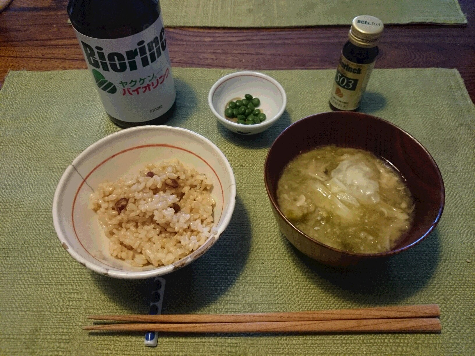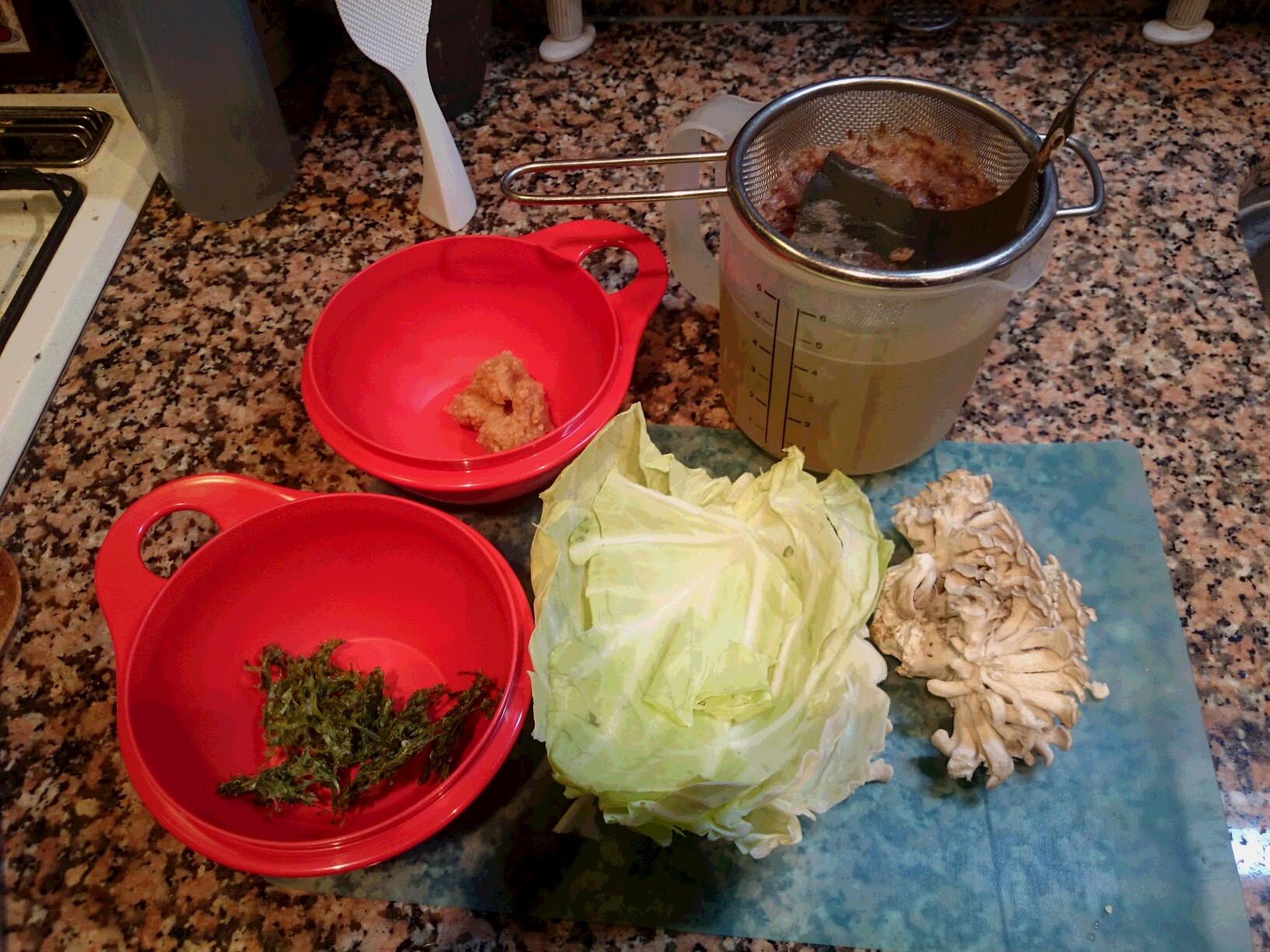 今朝は、キャベツ、まいたけ、あおさの味噌汁です。