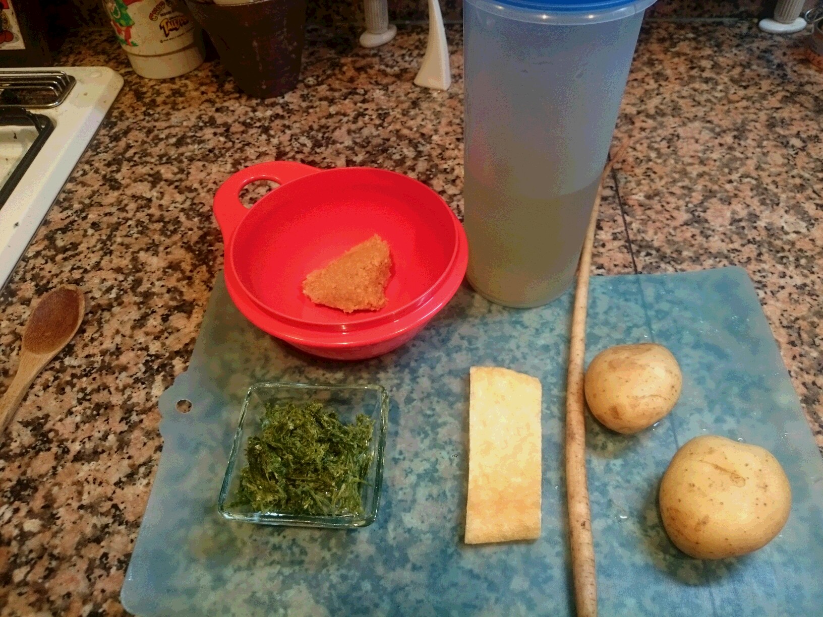 今朝は、新ごぼう、新じゃがいも、あおさ、うすあげの味噌汁です。