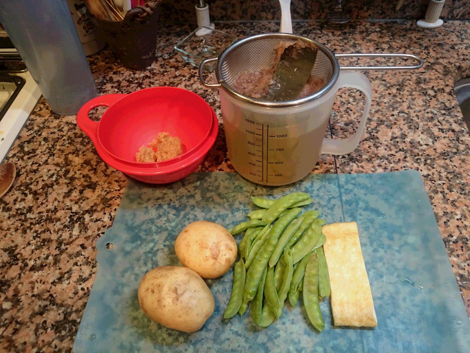 今朝は、新じゃがいも、きぬさや、うすあげの味噌汁です。