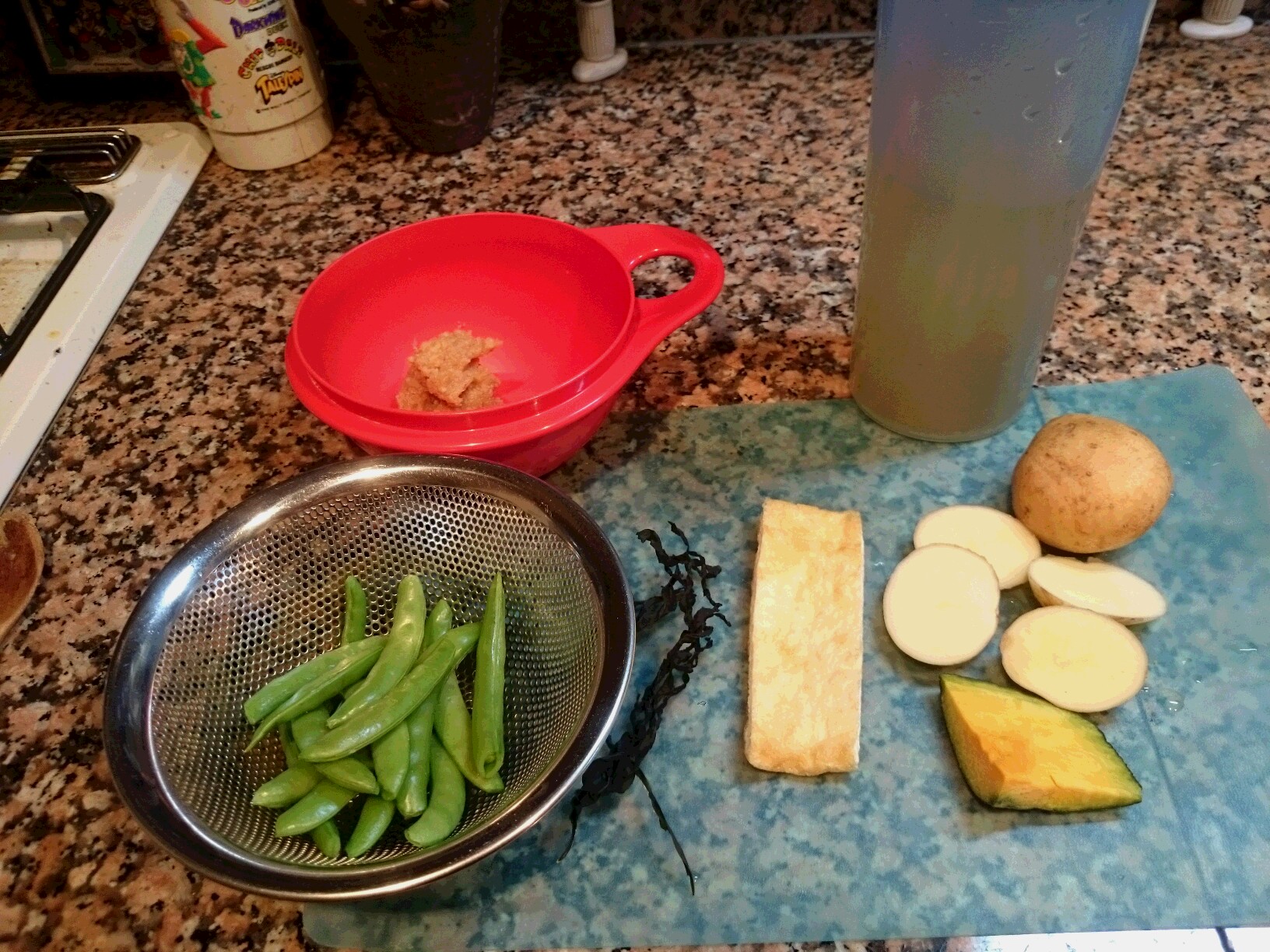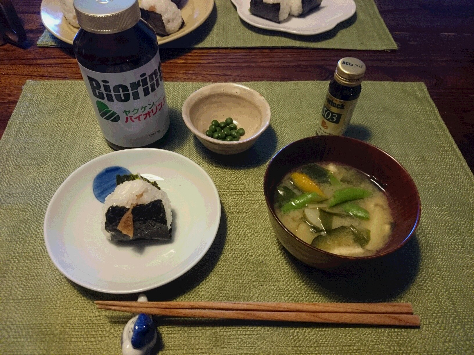 今朝は、新じゃがいも、スナップえんどう、わかめ、うすあげ、かぼちゃの味噌汁です今日は、今シーズンの最高気温の予報なので、梅干しのおにぎりにしました。