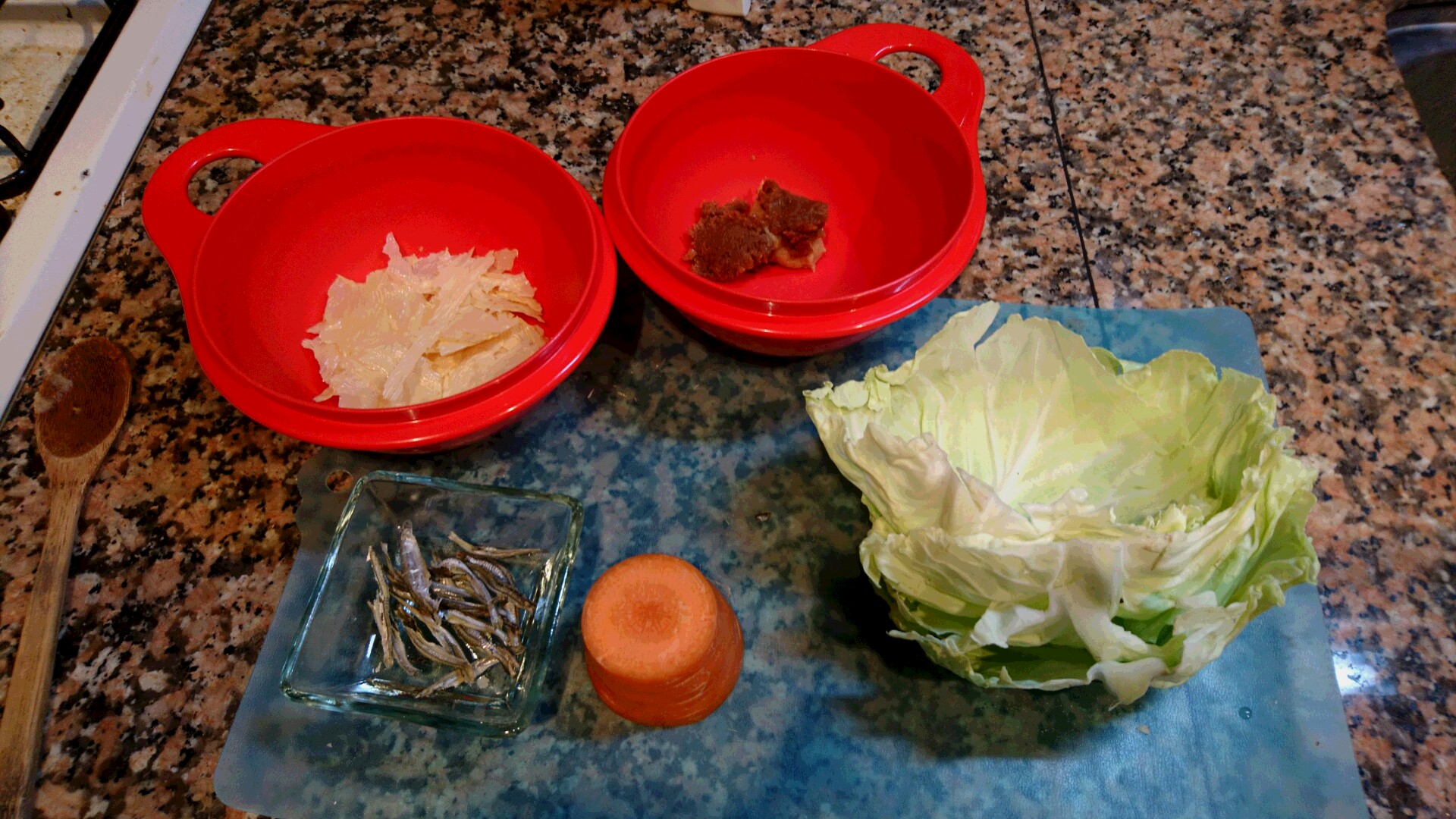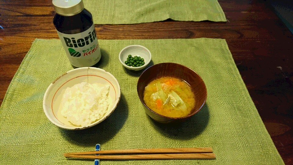 今朝は、キャベツ、人参、ゆば、いりこの味噌汁です。