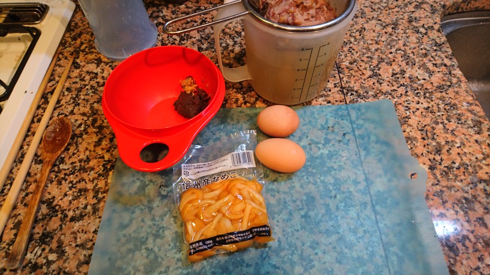 今朝は、なめこ、たまごの味噌汁です。
