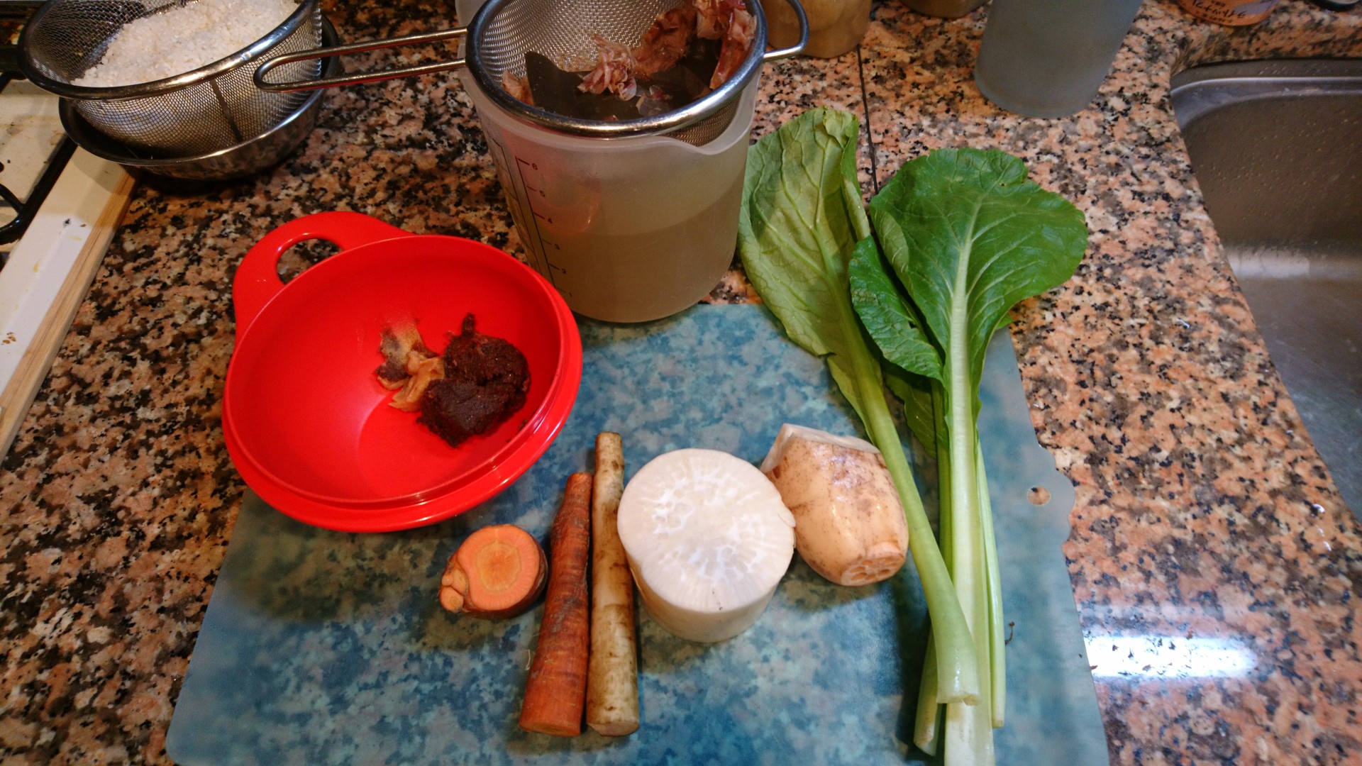 今朝は、小松菜、蓮根、大根、ごぼう、人参の味噌汁です。