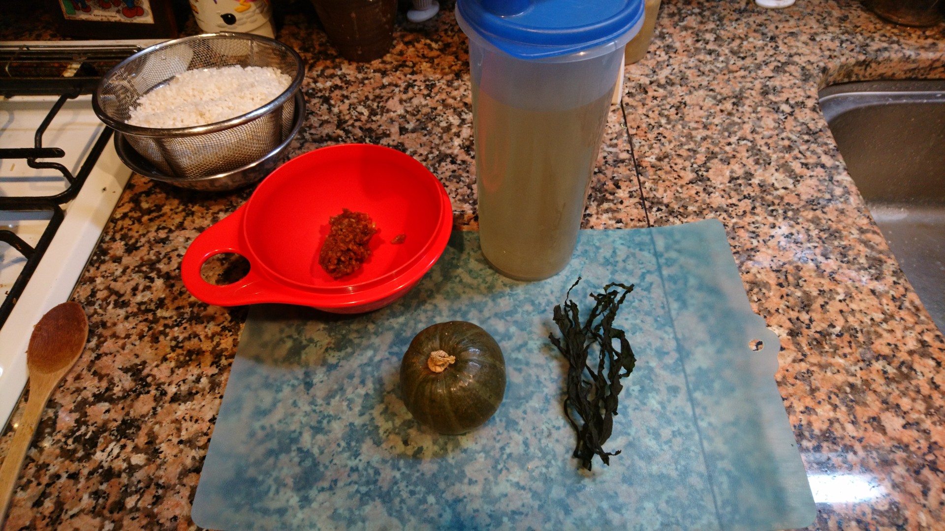 今朝は、坊ちゃんかぼちゃ、わかめの味噌汁です。