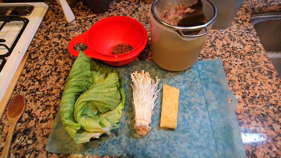 今朝は、キャベツ、えのき茸、うすあげの味噌汁です。