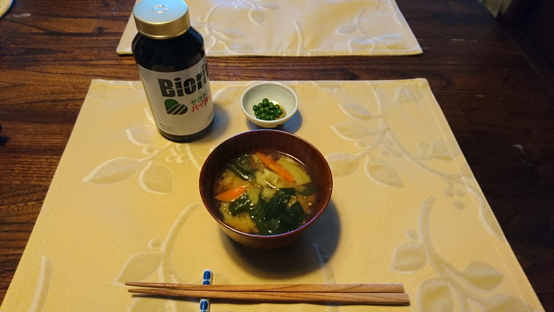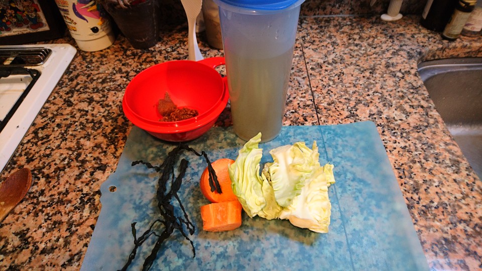 今朝は、人参、キャベツの芯、わかめの味噌汁です。