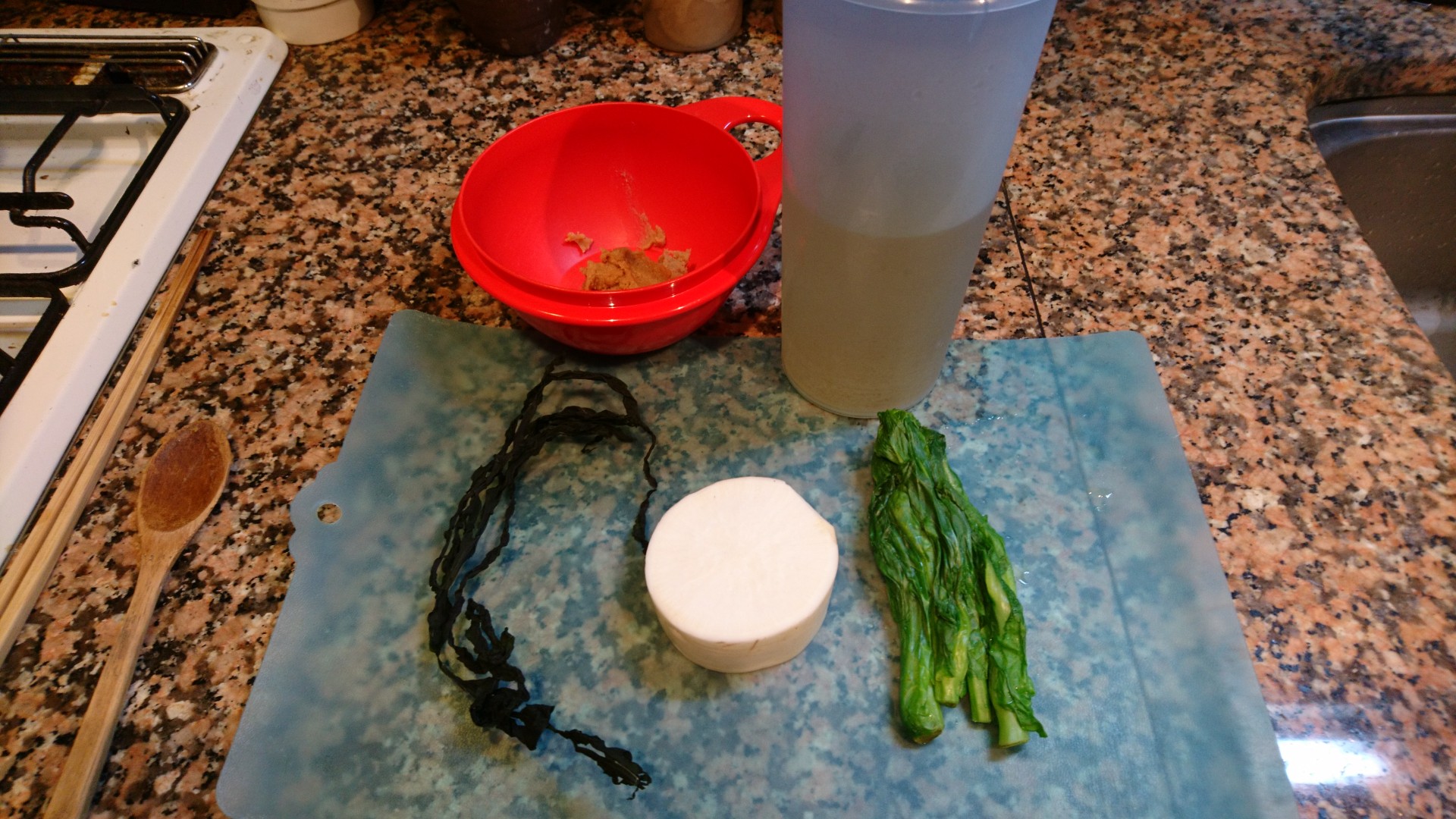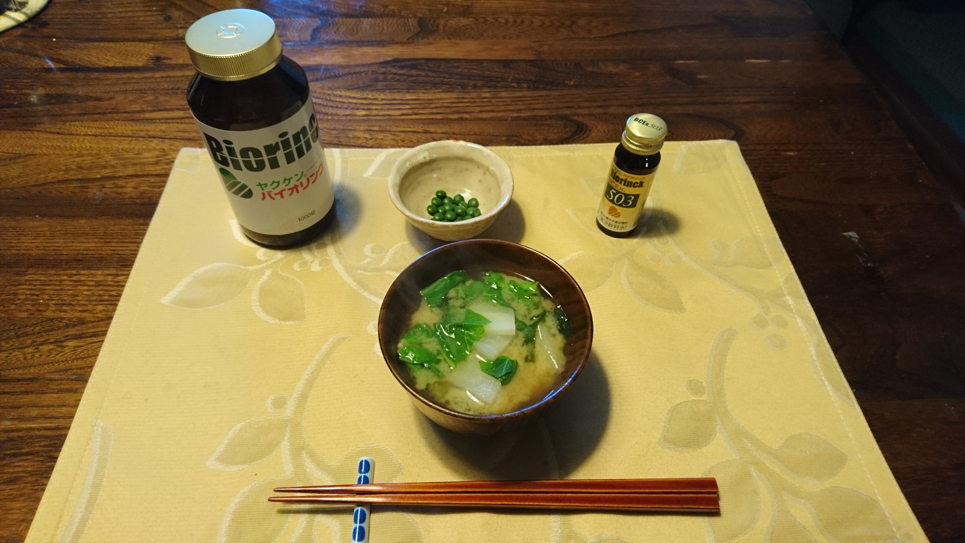 今朝は、大根、白菜の菜花、わかめの味噌汁です。