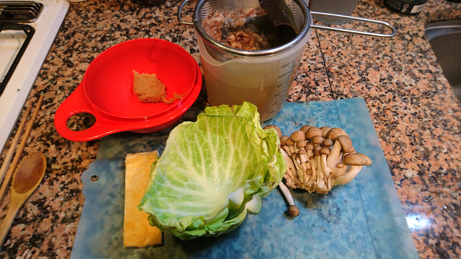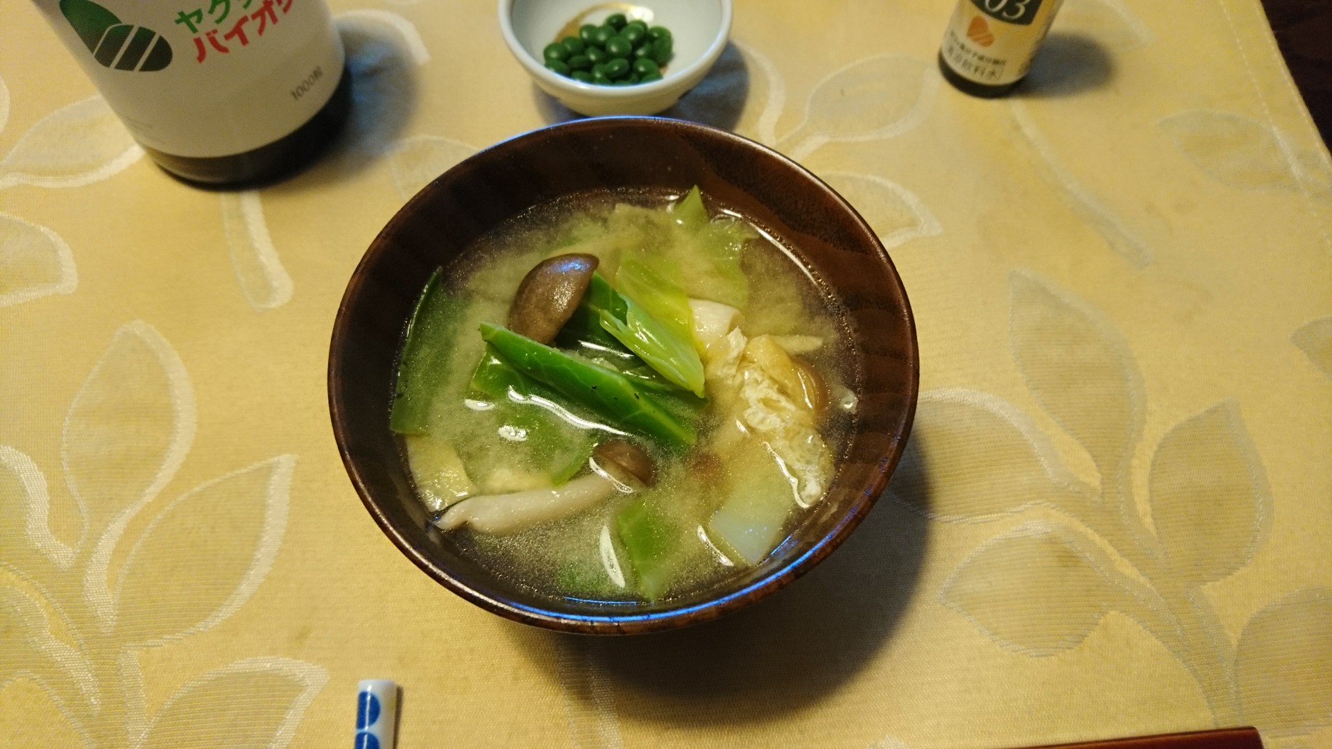 今朝は、うすあげ、きゃべつ、しめじの味噌汁です。