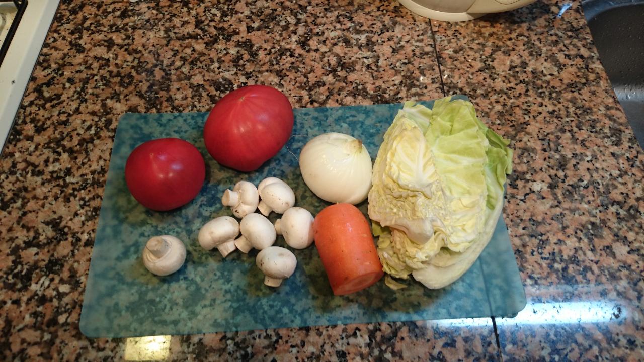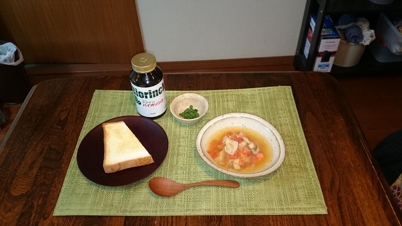 今朝は、トマト、玉ねぎ、マッシュルーム、キャベツのスープです。