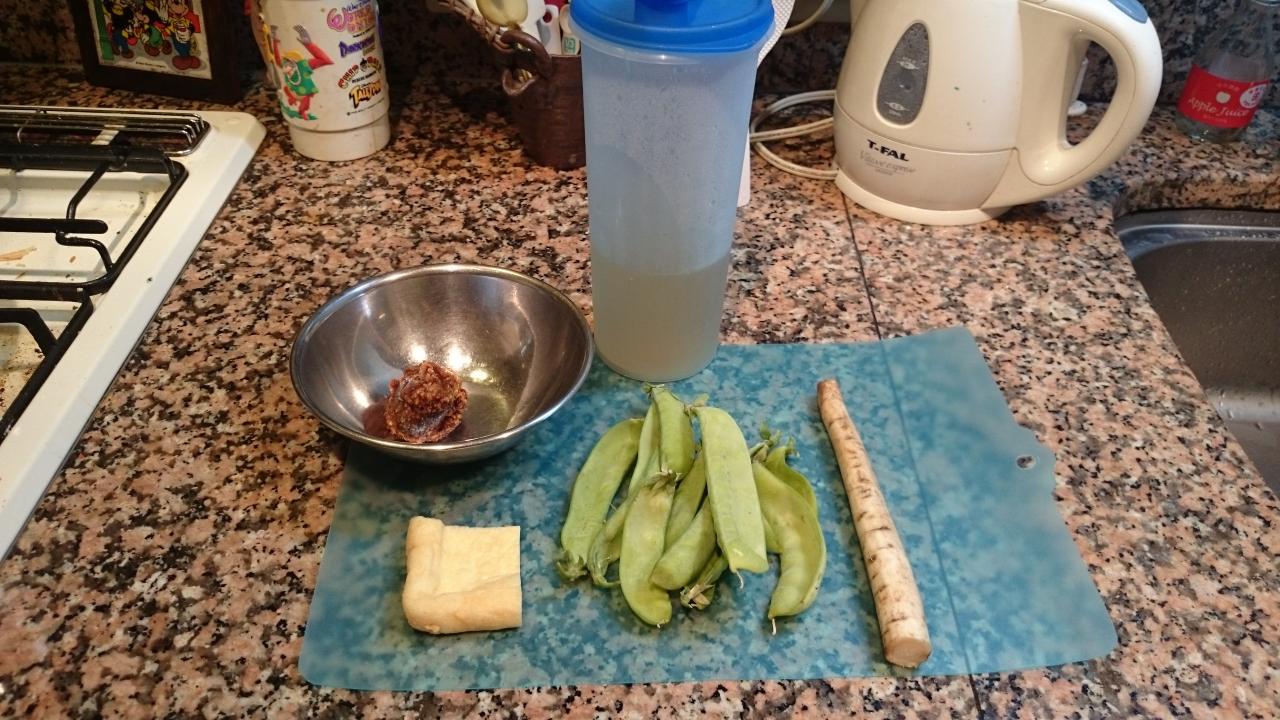 今朝は、ごぼう、絹さや、うすあげの味噌汁です。