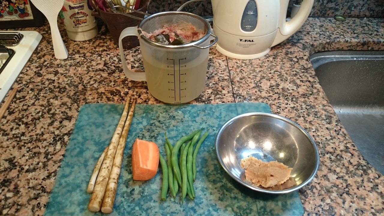 今朝は、ごぼう、人参、三度豆の味噌汁です。